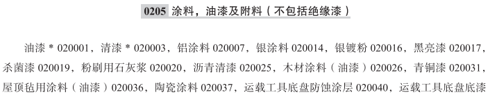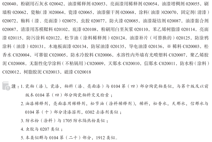 油漆020001; 清漆020003; 铝涂料020007; 银涂料020014; 银镀粉020016; 黑亮漆020017; 杀菌漆020019; 粉刷用石灰浆020020; 沥青清漆020025; 木材涂料(油漆)020026; 青铜漆020031; 屋顶毡用涂料(油漆)020036; 陶瓷涂料020037; 运载工具底盘防蚀涂层020040; 运载工具底盘底漆020040; 粉刷用石灰水020042; 油漆稀释剂020053; 亮面漆用稀释剂020054; 油漆增稠剂020055; 刷墙粉020062; 瓷釉(漆)020064; 瓷漆020065; 油漆催干剂020068; 涂料(油漆)020070; 固定剂(清漆)020072; 釉料(漆、亮面漆)020075; 虫胶020077; 防火漆020085; 油漆凝结剂020087; 油漆黏合剂020087; 清漆用苏模鞣料020102; 底漆020108; 粉刷用白垩灰浆020110; 苯乙烯树脂漆020114; 亮面漆020115; 防污涂料020122; 松节油(涂料稀释剂)020124; 油漆补片(可替换的)020125; 防涂鸦涂料(油漆)020131; 木地板面漆020134; 防尿油漆020135; 导电油漆020136; 稀料; 松香水; 可赛银; 防水冷胶料; 水溶性内外墙有光喷塑料; 聚乙烯胶泥; 无黏性化学涂料(不粘锅用); 天那水; 信那水; 防水粉(涂料); 树脂胶泥; 磁漆; 运载工具涂层用透明保护剂; 橱柜制作用清漆; 混凝土地面用油漆; 绘画漆; 合成涂料(油漆); 无溶剂油漆; 油性漆; 防水粉(油漆); 防腐蚀油漆; 刷墙粉(水性涂料); 水性漆; 用作涂料稀释剂的松节油; 透明涂料(油漆); 有色涂料(油漆); 运载工具用透明防护涂料; 房屋用漆; 工业装置用油漆; 机器用油漆; 陶瓷制造用油漆; 家具制造用油漆; 用作表面涂料的虫胶; 用作涂料干燥剂的催干剂; 标记路面用热塑性油漆; 生产加工用油漆; 建筑物外表面用彩色油漆; 海事用油漆; 防涂鸦用油漆; 发光漆; 建筑油漆; 陶器瓷漆; 抗病毒涂料(油漆); 耐热漆; 木器漆; 荧光漆; 油漆和油灰用黏合剂; 合成树脂涂料; 混凝土用辐射固化涂料; 车辆用防锈制剂涂层; 工艺品漆; 具有防水特性的涂料制剂(油漆); 家具制造用清漆; 用于表面涂漆做准备的底漆; 待涂表面用底漆; 防潮油漆; 虫胶清漆; 油漆类不粘涂层(涂料); 清漆(非绝缘漆); 涂料和腻子用干燥剂; 玻璃钢游泳池和水疗场所用非金属彩色表面涂层; 家具上光用涂料; 商业船舶用防腐油漆类涂料; 混凝土地面用环氧涂料; 混凝土地板用油漆; 地板保护清漆; 纸涂层用漆; 军事设备用伪装漆; 船体底壳漆; 汽车用漆; 防锈涂料; 防火油漆; 外墙漆; 防水涂料(油漆); 粉末涂料; 抗风化涂料(油漆); 聚氨酯清漆; 反光喷漆; 阻燃油漆; 漆稀释剂; 调和漆; 防腐油漆; 油毛毡用涂料(油漆); 搪瓷漆; 防水油漆; 喷漆; 地板用漆; 汽车制造用油漆; 内墙漆; 荧光涂料; 防火涂料; 防锈漆; 防腐蚀涂料; 装饰用喷涂式涂料;