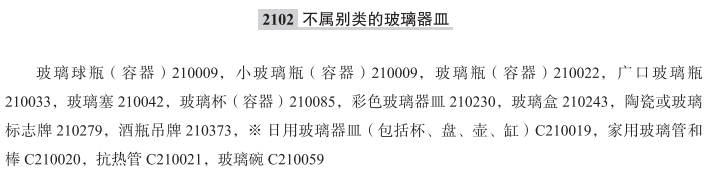 玻璃球瓶(容器)210009; 小玻璃瓶(容器)210009; 玻璃瓶(容器)210022; 广口玻璃瓶210033; 玻璃塞210042; 玻璃杯(容器)210085; 彩色玻璃器皿210230; 玻璃盒210243; 陶瓷或玻璃标志牌210279; 酒瓶吊牌210373; 日用玻璃器皿(包括杯、盘、壶、缸); 家用玻璃管和棒; 抗热管; 玻璃碗; 玻璃水瓶; 瓶用玻璃塞; 平底直壁玻璃杯; 用于工业包装容器的玻璃盖; 细长玻璃杯; 玻璃罐; 半升玻璃杯; 玻璃杯; 食品保存用玻璃罐; 带有密封螺旋盖的广口玻璃瓶; 玻璃碟; 药用玻璃卡式瓶(空的);