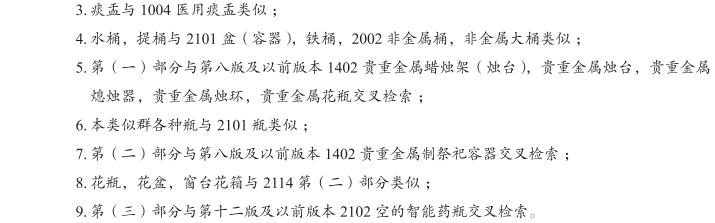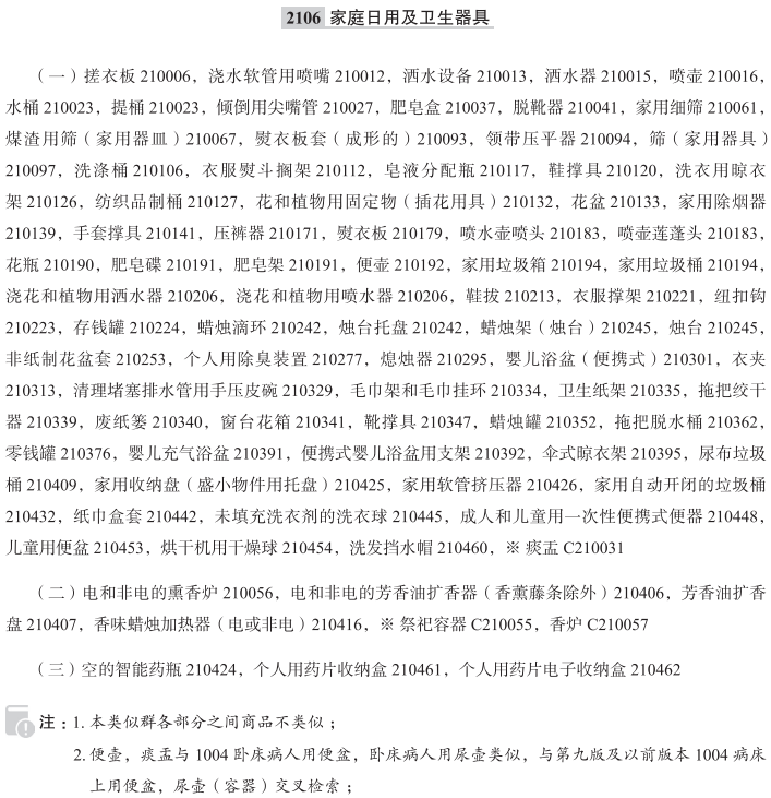 搓衣板210006; 洒水器210015; 喷壶210016; 水桶210023; 提桶210023; 倾倒用尖嘴管210027; 肥皂盒210037; 脱靴器210041; 电和非电的熏香炉210056; 家用细筛210061; 煤渣用筛(家用器皿)210067; 熨衣板套(成形的)210093; 领带压平器210094; 筛(家用器具)210097; 洗涤桶210106; 衣服熨斗搁架210112; 皂液分配瓶210117; 鞋撑具210120; 洗衣用晾衣架210126; 纺织品制桶210127; 花和植物用固定物(插花用具)210132; 花盆210133; 家用除烟器210139; 手套撑具210141; 压裤器210171; 熨衣板210179; 喷壶莲蓬头210183; 喷水壶喷头210183; 花瓶210190; 肥皂碟210191; 便壶210192; 家用垃圾桶210194; 家用垃圾箱210194; 浇花和植物用洒水器210206; 浇花和植物用喷水器210206; 鞋拔210213; 衣服撑架210221; 纽扣钩210223; 存钱罐210224; 蜡烛滴环210242; 烛台托盘210242; 蜡烛架(烛台)210245; 蜡烛架210245; 花枝烛台210245; 非纸制花盆套210253; 个人用除臭装置210277; 熄烛器210295; 婴儿浴盆(便携式)210301; 衣夹210313; 清理堵塞排水管用手压皮碗210329; 毛巾架和毛巾挂环210334; 卫生纸架210335; 拖把绞干器210339; 废纸篓210340; 窗台花箱210341; 靴撑具210347; 蜡烛罐210352; 拖把脱水桶210362; 零钱罐210376; 婴儿充气浴盆210391; 便携式婴儿浴盆用支架210392; 伞式晾衣架210395; 电和非电的芳香油扩香器(香薰藤条除外)210406; 芳香油扩香盘210407; 尿布垃圾桶210409; 香味蜡烛加热器(电或非电)210416; 空的智能药瓶210424; 家用收纳盘(盛小物件用托盘)210425; 家用软管挤压器210426; 家用自动开闭的垃圾桶210432; 纸巾盒套210442; 未填充洗衣剂的洗衣球210445; 成人和儿童用一次性便携式便器210448; 儿童用便盆210453; 烘干机用干燥球210454; 洗发挡水帽210460; 个人用药片收纳盒210461; 个人用药片电子收纳盒210462; 浴室用长柄水瓢210470; 洗澡用热水搅拌棒210471; 烛台210474; 纸巾架210476; 桌布坠210481; 痰盂; 祭祀容器; 香炉; 马桶搋子; 挂墙式肥皂碟; 花园水管用喷嘴; 家用废纸篓; 芳香油扩香器(非香薰藤条); 脏衣篮; 家用煤斗; 踏板式垃圾桶; 木制靴撑; 可折叠水桶; 洗头挡水帽; 熏香炉; 水桶或提桶专用盖; 花盆托架; 便携式儿童便盆; 柱蜡用盘; 植物篮; 桑拿用浇水桶; 毛巾架; 养花用碗; 靴楦(撑具); 尿布桶; 煤斗; 毛巾挂环; 安装在天花板上的升降式晾衣架; 安装在墙壁上的晾衣架; 贵金属制烛台; 贵金属烛环; 非贵金属制熄烛器; 贵金属制养花用碗; 贵金属制花瓶; 非贵金属制毛巾架; 非贵金属制毛巾挂环; 家用脏衣分类篮; 瓶用倾倒嘴; 漂洗用桶; 剃须碗; 家用洗衣篮; 多连灯烛台; 洗涤盆(非卫生器具部件); 液体香皂分配器(家用); 儿童塑料浴缸; 用于洗涤、上浆及拉伸后和服的干燥板; 鞋楦(鞋撑); 防风烛台; 牙刷架; 肥皂分配器; 裤子撑架; 特种服装专用晾衣架; 存放洗澡玩具用塑料桶; 香熏炉; 卫生纸卷架; 熨斗架; 储蓄罐; 挤牙膏器; 塑料水桶; 烛环; 玻璃制落地花瓶; 陶土制落地花瓶; 陶瓷花盆; 洒水软管喷嘴; 家用煤桶; 搔背器; 头皮抓挠器; 抓痒器; 花盆碟; 植物盆用塑料盖; 垃圾桶; 废物箱; 家用筛; 窗台上的花盆箱; 草坪洒水器; 浴室用桶; 熨衣板套; 垃圾筐; 剃须皂碗; 废纸篮; 个人用药盒; 拖把桶; 晾衣架; 非贵金属制烛台; 筛子(家庭用); 花盆托盘; 非金属存钱罐; 装干花瓣与香料混合物用盘; 玻璃烛台; 喷水壶; 纸制花盆; 鞋楦(撑具); 蜡烛盘; 纸巾盒用陶瓷套; 鞋撑; 婴儿用可折叠澡盆; 毛巾杆; 家庭用堆肥容器; 花园水管用洒水枪; 园艺用注射器; 花园水管用喷雾器; 壁式烛台;