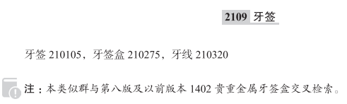 牙签210105; 牙签盒210275; 牙线210320; 贵金属制牙签盒; 电池驱动的牙线棒; 牙线棒; 带有味道的牙签;
