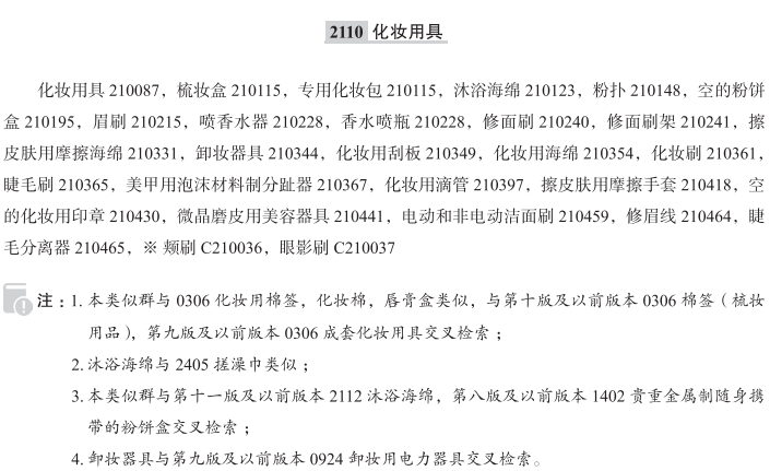 化妆用具210087; 梳妆盒210115; 专用化妆包210115; 沐浴海绵210123; 粉扑210148; 空的粉饼盒210195; 眉刷210215; 香水喷瓶210228; 喷香水器210228; 修面刷210240; 修面刷架210241; 擦皮肤用摩擦海绵210331; 卸妆器具210344; 化妆用刮板210349; 化妆用海绵210354; 化妆刷210361; 睫毛刷210365; 美甲用泡沫材料制分趾器210367; 化妆用滴管210397; 擦皮肤用摩擦手套210418; 空的化妆用印章210430; 微晶磨皮用美容器具210441; 电动和非电动洁面刷210459; 修眉线210464; 睫毛分离器210465; 电动洁面仪210477; 美容用黑头吸出器210482; 美容用粉刺吸出器210482; 颊刷; 眼影刷; 面部清洁用海绵; 面部上妆用海绵; 成套化妆用具; 去死皮用垫; 美容用微晶磨皮海绵; 电动化妆品涂抹器; 香水瓶(空); 售时为空的化妆用印章; 皮肤清洁刷; 贵金属制粉饼盒(空的); 粉扑收纳架; 染发碗; 扑爽身粉用海绵; 去死皮用手套; 香水喷瓶(空的); 唇彩刷; 化妆用刷; 化妆用上妆棒; 化妆用滴管(空的); 面部去角质垫; 出售时为空的香水喷瓶; 去角质刷; 卸妆器具(电); 卸妆器具(非电); 睫毛梳; 沐浴用天然海绵; 剃须刷; 粉饼盒(空的);