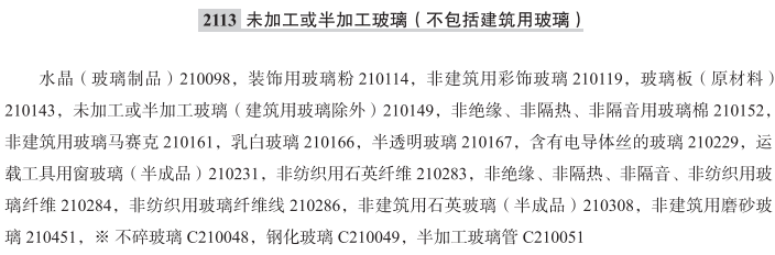水晶(玻璃制品)210098; 装饰用玻璃粉210114; 非建筑用彩饰玻璃210119; 玻璃板(原材料)210143; 未加工或半加工玻璃(建筑用玻璃除外)210149; 非绝缘、非隔热、非隔音用玻璃棉210152; 非建筑用玻璃马赛克210161; 乳白玻璃210166; 半透明玻璃210167; 含有电导体丝的玻璃210229; 运载工具用窗玻璃(半成品)210231; 非纺织用石英纤维210283; 非绝缘、非隔热、非隔音、非纺织用玻璃纤维210284; 非纺织用玻璃纤维线210286; 非建筑用石英玻璃(半成品)210308; 非建筑用磨砂玻璃210451; 不碎玻璃; 钢化玻璃; 半加工玻璃管; 非建筑用夹丝玻璃板; 玻璃条(非建筑用); 未加工或半加工玻璃(非建筑用); 非建筑用平板压花玻璃; 未加工的运载工具用窗玻璃; 非建筑用钢化玻璃; 非建筑物用彩色窗玻璃; 非建筑物用普通玻璃; 装饰玻璃(非建筑物用); 车窗用玻璃(粗加工的); 含有电导体丝的玻璃(非建筑用); 非建筑用改性平板玻璃; 夹层平板玻璃(非建筑用); 发光玻璃(非建筑用); 半加工玻璃(建筑用玻璃除外); 非建筑用普通平板玻璃; 非建筑用改性玻璃薄板; 非建筑用夹层平板玻璃; 合成灵敏导电玻璃; 非纺织用玻璃纤维; 非建筑用彩色玻璃板; 非建筑用装饰玻璃; 非纺织用矽玻璃纤维; 未加工或半加工玻璃(建筑玻璃除外); 非建筑用发光玻璃;