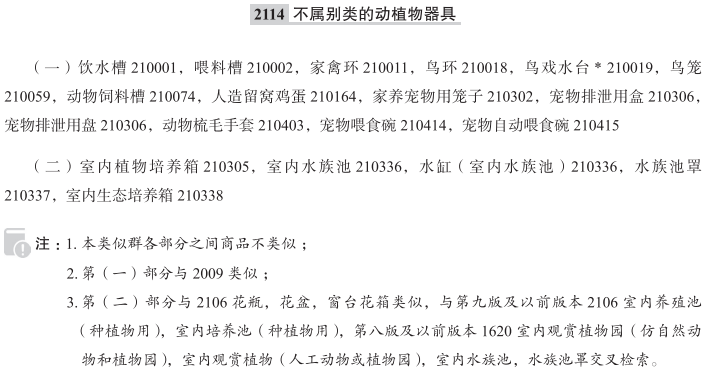 饮水槽210001; 喂料槽210002; 家禽环210011; 鸟环210018; 鸟戏水台210019; 鸟笼210059; 动物饲料槽210074; 人造留窝鸡蛋210164; 家养宠物用笼子210302; 室内植物培养箱210305; 宠物排泄用盒210306; 宠物排泄用盘210306; 室内水族池210336; 水缸(室内水族池)210336; 水族池罩210337; 室内生态培养箱210338; 动物梳毛手套210403; 宠物喂食碗210414; 宠物自动喂食碗210415; 水族池用抄鱼网210472; 宠物舔食垫210473; 宠物排泄用盒(盘); 动物自启动喂食器; 动物自启动喝水器; 鸟喂食台; 动物用饮水槽; 宠物用笼子; 喂鸟器; 鸟戏水台(非建筑物); 鸟笼站杠; 水母缸; 爬宠饲养箱; 蚂蚁生态箱; 牲畜用饮水槽; 携带宠物用笼子; 装宠物零食用罐; 鸟用识别环; 鸟食台(非建筑物); 动物用室内生态培养箱; 昆虫用室内生态培养箱; 宠物用自动便盆; 室内蚂蚁生态巢; 养鱼用水箱; 能刺激动物的牲畜喂食器; 能刺激动物的牲畜饮水器; 狗粮勺; 家禽用鸟笼; 可便携式给宠物喂水的非机械化宠物饮水器; 动物饲料槽(牲畜食槽); 养金鱼用玻璃碗; 鸟食台; 室内昆虫栖息地; 室内昆虫生态培养箱; 自启动式动物喂食器; 宠物用喂食器皿; 兽用喂料槽; 兽用饮水槽; 小动物喂食器; 水族池装饰物; 宠物进食和饮水用碗; 宠物喂食盘; 宠物自动喂食器; 宠物饮水碗; 猫砂盆; 园艺种植箱; 家禽饮水槽; 非机械化动物喂食器; 牛用饮水槽; 猪饲槽; 家禽料槽;