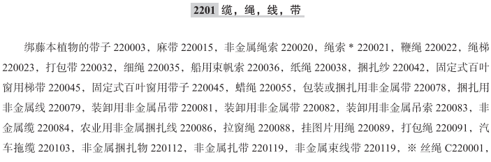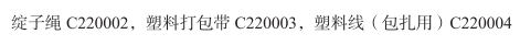 绑藤本植物的带子220003; 麻带220015; 非金属绳索220020; 绳索220021; 鞭绳220022; 绳梯220023; 打包带220032; 细绳220035; 船用束帆索220036; 纸绳220038; 捆扎纱220042; 固定式百叶窗用梯带220045; 固定式百叶窗用带子220045; 蜡绳220055; 包装或捆扎用非金属带220078; 捆扎用非金属线220079; 装卸用非金属吊带220081; 装卸用非金属带220082; 装卸用非金属吊索220083; 非金属缆220084; 农业用非金属捆扎线220086; 拉窗绳220088; 挂图片用绳220089; 打包绳220091; 汽车拖缆220103; 非金属捆扎物220112; 非金属扎带220119; 非金属束线带220119; 丝绳; 绽子绳; 塑料打包带; 塑料线(包扎用); 装卸用织物制吊索; 包装绳; 合股绳; 宠物玩具用绳索; 非金属弹力绳; 降落伞绳; 尼龙捆绑带; 塑料绑扎带; 天然纺织纤维制捆扎绳; 家庭用塑料扎带; 庭园用塑料扎带; 纺织纤维制绳; 航海用绳索; 登山绳; 捆包绳; 弹力绑绳; 攀岩绳; 汽车用牵引绳; 麻制绳索; 栏杆用绳; 草绳; 包装带; 套索; 软百叶窗用梯形带; 合股线; 软百叶帘用梯形带; 缆绳; 锚索; 捆绑用橡皮筋; 弹力绳;