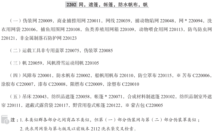 风障布220001; 防水油布220002; 防水帆布220002; 伪装网220009; 商业捕捞用网220011; 网线220039; 吊床220043; 捕动物陷网220048; 纺织品遮篷220058; 帆220059; 帐篷220071; 运载工具非专用盖罩220075; 伪装罩220085; 网220094; 合成材料制遮篷220102; 风筝滑雪运动用帆220105; 风帆滑雪运动用帆220105; 雪地风筝运动用帆220105; 洗衣用网袋220106; 捕鱼用围网220108; 鱼类养殖用网箱220109; 船帆用帆布220110; 纺织品制室外遮帘220111; 动物喂食用网220113; 防尘罩布220115; 遮蔽式露营袋220117; 防鸟防虫网220121; 野营用卷式帐篷220122; 非金属制落石防护网220123; 庭院伞220125; 蒙古包; 苫布; 涂胶布; 漆布; 阻燃布; 涂塑布; 登山或野营用充气帐篷; 汽车非专用盖罩; 纺织品制帐篷; 双体船用帆; 陷阱网; 多用途的塑料防水布; 雷达用伪装网; 视觉用伪装网; 商业用渔网; 乙烯地布; 帆板用帆; 纺织品制室外百叶帘; 船和海上运载工具的非专用盖罩; 帆船运动用帆; 涂塑材料制防水帆布; 网(非金属、非石棉制); 玻璃纤维网; 非船用防水帆布; 非野营用帐篷; 棉网; 渔网; 洗针织品用袋; 麻网; 登山或野营用帐篷; 露营时铺地用防潮布; 船用防水帆布; 化学纤维网; 游艇用帆; 丝网;