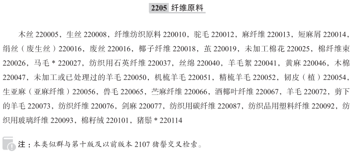 木丝220005; 生丝220008; 纤维纺织原料220010; 驼毛220012; 麻纤维220013; 短麻屑220014; 绢丝(废生丝)220016; 废丝220016; 椰子纤维220018; 茧220019; 未加工棉花220025; 棉纤维束220026; 马毛220027; 纺织用石英纤维220037; 丝绵220040; 羊毛絮220041; 黄麻220046; 木棉220047; 未加工或已处理过的羊毛220050; 机梳羊毛220051; 精梳羊毛220052; 韧皮(植)220054; 生亚麻(亚麻纤维)220056; 兽毛220065; 苎麻纤维220066; 酒椰叶纤维220067; 羊毛220072; 剪下的羊毛220073; 纺织纤维220076; 剑麻220077; 纺织用碳纤维220087; 纺织品用塑料纤维220092; 纺织用玻璃纤维220093; 棉籽绒220101; 猪鬃220114; 纺织用涤纶短纤220124; 装潢填充用聚酯纤维220126; 羊驼毛; 未加工的纺织纤维; 非纺织、非制刷用马毛; 纺织用长丝; 未加工或加工过的羊毛; 蚕茧; 丝纤维; 纺织用金属纤维; 纺织用化学纤维; 纺织用碳化纤维; 兔毛; 纺织用聚酯纤维; 真麻纤维(原料); 木丝(木质细刨花); 羊毛(原材料); 粗兽毛; 半合成纤维(纺织用); 剑麻纤维(未加工的); 未加工酒椰纤维; 苎麻纤维(原料); 亚麻纤维(原料); 玻璃纤维(纺织用); 安哥拉山羊毛; 黄麻纤维(原料); 纺织用纤维原料; 纺织用陶瓷纤维; 家畜毛发(非纺织、非制刷用); 马毛(非纺织、非制刷用); 貉毛(非纺织、非制刷用); 纺织用合成纤维; 棉纤维; 剑麻纤维; 非制刷用猪鬃; 纺织用塑料纤维; 纺织用矽玻璃纤维; 羊绒;