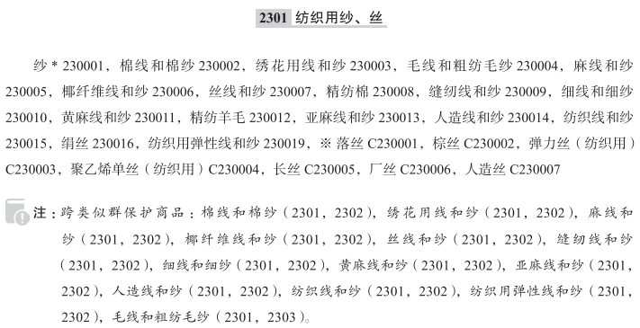 纱230001; 棉线和棉纱230002; 绣花用线和纱230003; 毛线和粗纺毛纱230004; 麻线和纱230005; 椰纤维线和纱230006; 丝线和纱230007; 精纺棉230008; 缝纫线和纱230009; 细线和细纱230010; 黄麻线和纱230011; 精纺羊毛230012; 亚麻线和纱230013; 人造线和纱230014; 纺织线和纱230015; 绢丝230016; 纺织用弹性线和纱230019; 落丝; 棕丝; 弹力丝(纺织用); 聚乙烯单丝(纺织用); 长丝; 厂丝; 人造丝; 合成纤维线和纱; 废棉纱; 手工绢丝纱; 真麻线和纱; 安哥拉羊毛纱; 驼绒毛纱; 纺织用化纤线和纱; 真丝纱; 纺织用玻璃纱; 生丝纱; 手织羊毛; 混纺线和纱; 手织纱; 野蚕丝纱; 半合成纤维线和纱(经过化学处理的天然纤维纱); 以丝为主的混纺线和纱; 加捻棉线和纱; 加捻麻线和纱; 加捻混纺线和纱; 加捻丝线和纱; 加捻线和纱; 加捻羊毛线和纱; 以羊毛为主的混纺线和纱; 手织纱线; 以化学纤维为主的混纺线和纱; 以棉为主的线和纱; 手工绢丝纱线; 耐热纱和线; 以麻纤维为主的混纺线和纱; 以无机纤维为主的混纺线和纱; 苎麻线和纱; 脱脂的废线和纱; 纺织用纱; 棉纱; 羽绒纱; 玻璃纤维线和纱; 双宫丝纱; 精纺毛纱; 纺织用弹性纱; 针织用纱; 椰纤维纱; 精纺毛线和毛纱;