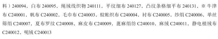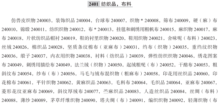 仿兽皮织物240003; 装饰织品240004; 台球布240007; 织物240008; 筛布240009; 硬(麻)布240010; 锦缎240011; 纺织织物240012; 布240013; 挂毯和刺绣用粗帆布240015; 麻织物240017; 麻布240018; 片状纺织品帽衬240019; 鞋的衬里织物240020; 鞋用织物240021; 舍味呢(布料)240023; 丝绒240026; 棉织品240028; 坚质条纹棉布(亚麻布)240031; 绉布(织物)240035; 重绉纹织物240036; 缎子240037; 内衣用织物240038; 衬料(纺织品)240039; 弹性纺织织物240046; 刺绣用描绘布240049; 绣花图案布240049; 法兰绒(织物)240050; 起绒粗呢(布)240052; 干酪布240053; 粗斜纹布240054; 纱布(布)240056; 马毛与绒布混织物(粗麻布)240058; 印花用丝织品240060; 印花棉布240061; 平针织物240062; 黄麻织品240063; 毛料布240064; 毛织品240064; 亚麻布240067; 菱形花纹亚麻布240069; 斜纹厚绒布240077; 苎麻织品240083; 人造丝织品240084; 丝绸(布料)240088; 薄纱240089; 茅草纤维织物240090; 塔夫绸(布)240091; 编织织物240092; 轻薄织物(布料)240094; 白布240095; 绳绒线织物240111; 平纹细布240127; 凸纹条格细平布240131; 蜡染印花布240139; 聚酯纤维织物240140; 蕾丝花边织物240141; 牛津布; 帆布; 毛巾布; 蚊帐织布; 衬布; 纱绢; 单丝筛绢; 夏布罗纹; 麻皮布; 蓖麻绢纺; 麻绒; 静电植绒布; 呢绒; 棉纱编织织物; 化纤纱编织织物; 灯芯绒织物; 纺织纤维织物; 网眼编织织物; 牛仔布; 服装用弹性织物; 无机纤维混纺织物; 丝棉混纺织物; 香云纱; 色丁布; 麻毛混合织物; 以棉为主的混纺织物; 麻丝混合织物; 裁缝用按规格裁切布; 服装用纺织品衬料; 化学纤维为主的混纺织物; 金属纤维面料; 纺织用纸纱织物; 榻榻米垫边饰用布; 混合纤维织物; 粗纺毛织物; 丝织物; 真麻织物; 羊毛纱织物; 毛绒面料; 内衣用纺织织物; 弹性纱混合织物; 再生纤维纱线制织物; 精纺丝织品; 以丝为主的混纺织物; 以麻纤维为主的混纺织物; 麻纱织物; 窄幅机织物; 服装针织面料; 毛线编织织物; 化纤织物; 起绒布; 合成纤维织物; 毛棉混纺织物; 麻棉混合织物; 精纺织物; 丝线编织织物; 亚麻织物; 手工绢丝织物; 纺织的弹性布料; 纱罗织物; 机织物; 台球呢(台面呢); 塔夫绸; 窗帘布; 数码印花用纺织面料; 半合成纤维织物; 亚麻织品; 鞋用衬里织物; 印花丝织品; 粘胶纤维织物; 丝毛混纺织物; 废棉织物; 黄麻织物; 仿兽皮的纺织织物; 以羊毛为主的混纺织物; 装饰织物;
