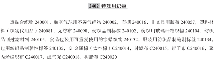 热黏合织物240001; 航空气球用不透气织物240002; 布棚240016; 非文具用胶布240057; 塑料材料(织物代用品)240081; 无纺布240098; 纺织品制标签240102; 纺织用玻璃纤维织物240104; 纺织品制过滤材料240105; 食品包装用可重复使用的涂蜡织物240132; 服装用纺织品制缝制标签240134; 包用纺织品制黏性标签240135; 金属棉(太空棉); 过滤布; 帘子布; 聚丙烯编织布; 滤气呢; 树脂布; 标识衣物用纺织品制标签; 条形码用纺织品制标签; 涂胶防水布; 油布; 印刷的纺织标签; 纺织品标签; 布制标签; 鉴别服装用纺织品标签; 橡胶布; 熔喷布; 热黏合纤维布;