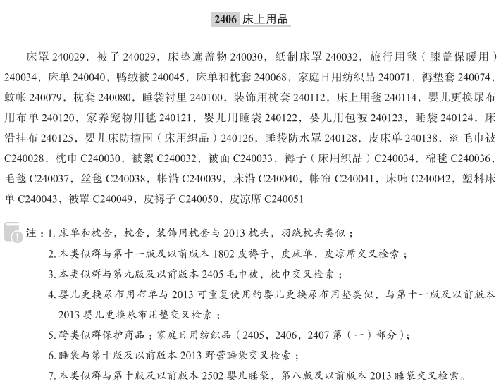 被子240029; 床罩240029; 床垫遮盖物240030; 纸制床罩240032; 旅行用毯(膝盖保暖用)240034; 床单240040; 鸭绒被240045; 床单和枕套240068; 家庭日用纺织品240071; 褥垫套240074; 蚊帐240079; 枕套240080; 睡袋衬里240100; 装饰用枕套240112; 床上用毯240114; 婴儿更换尿布用布单240120; 家养宠物用毯240121; 婴儿用睡袋240122; 婴儿用包被240123; 睡袋240124; 床沿挂布240125; 婴儿床防撞围(床用织品)240126; 睡袋防水罩240128; 皮床单240138; 毛巾被; 枕巾; 被絮; 被面; 褥子(床用织品); 棉毯; 毛毯; 丝毯; 帐沿; 床沿; 帐帘; 床帏; 塑料床单; 被罩; 皮褥子; 皮凉席; 床上铺的褥垫; 褥子; (野外用的)睡袋; 儿童用毯; 床单(纺织品); 布床幔; 床毯; 床幔; 大被子; 涂有杀昆虫剂的蚊帐; 露营用睡袋; 毛巾被单; 毛巾床罩; 经编被子; 四边可包住床垫的床单; 四边可包住床垫的床罩; 丝绸床毯; 婴儿的睡袋(被褥); 羽绒被; 羊毛毯; 户外用毯; 塑料床单(非失禁用垫); 蚕丝被; 床裙; 毯子; 婴儿用毯; 婴儿和小孩睡袋; 野营用睡袋; 盖膝用毯; 婴儿睡袋; 蚕丝毯; 防水床单; 睡袋(被子替代物); 纺织品被子; 婴儿睡袋(用于代替被子的套子); 旅行毯; 休闲毯; 阿富汗毛毯; 婴儿床床单; 婴儿和儿童用的睡袋; 被套; 床垫套; 婴儿用睡袋(被子替代物);