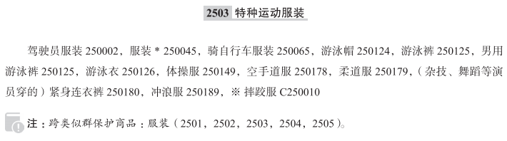 驾驶员服装250002; 服装250045; 骑自行车服装250065; 游泳帽250124; 游泳裤250125; 男用游泳裤250125; 游泳衣250126; 体操服250149; 空手道服250178; 柔道服250179; 武术服250179; (杂技、舞蹈等演员穿的)紧身连衣裤250180; 冲浪服250189; 摔跤服; 比基尼泳衣; 女式泳衣; 骑自行车短裤; 三点式游泳衣; 单比基尼式泳装; 女式分体泳装; 女式连身泳衣; 带胸罩的女式泳衣; 男式泳衣; 剑道服装; 水上运动用防磨衣; 合气道服; 男式和女式的游泳衣; 比基尼泳装; 运动紧身衣; 格斗运动用服装; 泳衣; 跆拳道服;
