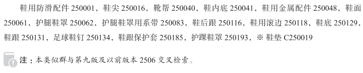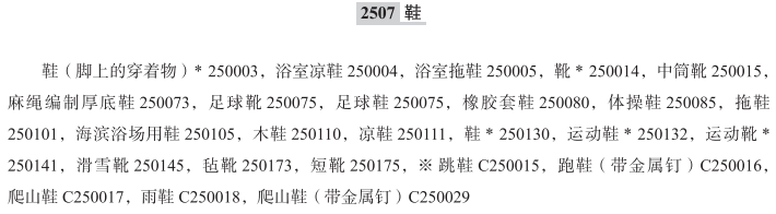 鞋用防滑配件250001; 鞋(脚上的穿着物)250003; 浴室凉鞋250004; 浴室拖鞋250005; 靴250014; 中筒靴250015; 鞋尖250016; 靴帮250040; 鞋内底250041; 鞋用金属配件250048; 鞋面250061; 护腿鞋罩250062; 麻绳编制厚底鞋250073; 足球靴250075; 足球鞋250075; 橡胶套鞋250080; 护腿鞋罩用系带250083; 体操鞋250085; 拖鞋250101; 海滨浴场用鞋250105; 木鞋250110; 凉鞋250111; 鞋后跟250116; 鞋用滚边250118; 鞋底250129; 鞋250130; 鞋跟250131; 运动鞋250132; 足球鞋钉250134; 运动靴250141; 滑雪靴250145; 毡靴250173; 短靴250175; 鞋跟保护套250185; 护踝鞋罩250193; 跳鞋; 跑鞋(带金属钉); 爬山鞋; 雨鞋; 鞋垫; 爬山鞋(带金属钉); 电热靴; 草鞋; 篮球鞋; 非运动用鞋; 带钉跑鞋; 训练鞋; 女鞋; 棒球鞋; 凉拖; 工作靴; 钓鱼用防水长靴; 俄罗斯羊毛毡靴; 高筒裘里雪地靴; 便于穿脱的鞋; 交谊舞鞋; 登山靴; 橡胶或塑料制压纹鞋跟; 橡胶或塑料制压纹鞋底; 跑鞋; 儿童雨靴; 夹趾凉鞋用防滑垫; 球鞋; 高尔夫球鞋; 日式分趾工作鞋; 修脚时穿的泡沫拖鞋; 马靴; 平底鞋; 皮鞋; 日式草屐的上底面; 藤编的日式草屐的上底面; 日式木屐的木屐台; 日式木屐的木屐齿; 木鞋(鞋); 有搭扣带的鞋; 鹿皮软底鞋; 日式木屐带; 女士可折叠拖鞋; 胶底布鞋用橡胶鞋底; 木屐式凉鞋; 日式草屐底; 手球运动鞋; (雨天穿的)高齿木屐; 鞋靴用鞋垫; 骑摩托车穿的靴子; 芭蕾舞软鞋; 日式毡凉鞋; 日式草屐; 晴天用矮齿木屐; 矮齿木屐; 冬靴; 步行鞋; 鞋用保护性构件; 女靴; 系带靴子; 骑自行车鞋; 套鞋; 甲板鞋; 排球鞋; 雪地靴; 曲棍球鞋; 正装鞋; 童鞋; 日式木屐用金属配件; 登山鞋; 皮拖鞋; 靴套; 维修用鞋底; 雨天穿的高齿木屐; 骑马鞋; 休闲鞋; 厚底鞋; 军靴; 帆布鞋; 乙烯塑料鞋; 徒步靴; 涉水鞋; 橡胶鞋; 高筒橡胶套鞋; 自行车鞋; 一次性拖鞋; 鞋掌; 橄榄球鞋; 鞋中底; 田径运动鞋; 滑雪鞋; 系带靴; 护士鞋; 夹趾拖鞋; 女式短靴; 徒步鞋; 工作鞋; 帆布便鞋; 芭蕾舞鞋; 男鞋; 日式皮凉鞋; 拖鞋鞋底; 拳击鞋; 日式草鞋; 鞋(矫形鞋除外); 攀岩鞋; 靴用金属配件; 舞鞋; 日式木屐; 鞋舌; 钓鱼用鞋; 木底鞋; 网球鞋; 夹趾凉鞋; 人字拖鞋; 保龄球鞋; 便鞋;