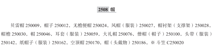 贝雷帽250009; 帽子250012; 无檐便帽250024; 风帽(服装)250027; 帽衬架(支撑架)250028; 帽檐250030; 帽250046; 耳套(服装)250059; 大礼帽250076; 头带(服装)250142; 纸帽子(服装)250162; 空顶帽250170; 帽(头戴物)250186; 斗笠; 钟形女帽; 骑行帽; 御寒用耳罩(服装); 帽舌; 巴拉克拉瓦头套; 浅顶软呢帽; 圆锥形绒线帽; 无边帽; 系带软帽; 宽顶无沿圆帽; 头部吸汗带; 防汗用头带; 无檐针织帽; 制帽用帽舌; 皮帽; 软帽; 船形帽; 平底硬草帽; 箬笠; 羊毛帽; 沙滩帽; 棒球帽; 带檐帽; 针织帽; 无边女帽; 自行车帽; 毛皮帽子; 运动帽; 雨帽; 小帽子; 无沿便帽; 儿童帽; 无边软帽; 带帽舌的帽子; 睡帽; 遮阳帽舌; 土耳其毡帽; 时装帽; 耳套; 渔夫帽; 高尔夫球帽;