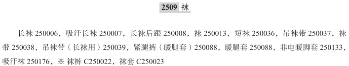 长袜250006; 吸汗长袜250007; 长袜后跟250008; 袜250013; 短袜250036; 吊袜带250037; 袜带250038; 吊袜带(长袜用)250039; 紧腿裤(暖腿套)250088; 暖腿套250088; 非电暖脚套250133; 吸汗袜250176; 电热袜250207; 电热或非电热暖脚套250208; 袜裤; 袜套; 连裤袜; 连体袜; 分趾袜; 拖鞋袜; 保暖袜; 短筒袜; 瑜伽袜; 新娘用吊袜带; 防汗袜; 踝袜; 运动用长袜; 羊毛袜; 新娘用袜带; 男式短袜; 过膝袜; 绑腿; 防滑袜; 裤袜; 及膝长袜; 日式分趾袜;