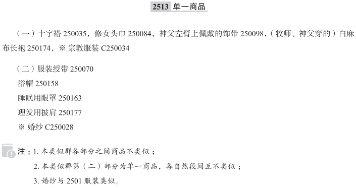 十字褡250035; 服装绶带250070; 修女头巾250084; 神父左臂上佩戴的饰带250098; 浴帽250158; 睡眠用眼罩250163; (牧师、神父穿的)白麻布长袍250174; 理发用披肩250177; 剃须围布250209; 婚纱; 宗教服装; 理发店和美容院用防护衣; 神职人员穿的长袍; 尼卡布面纱;