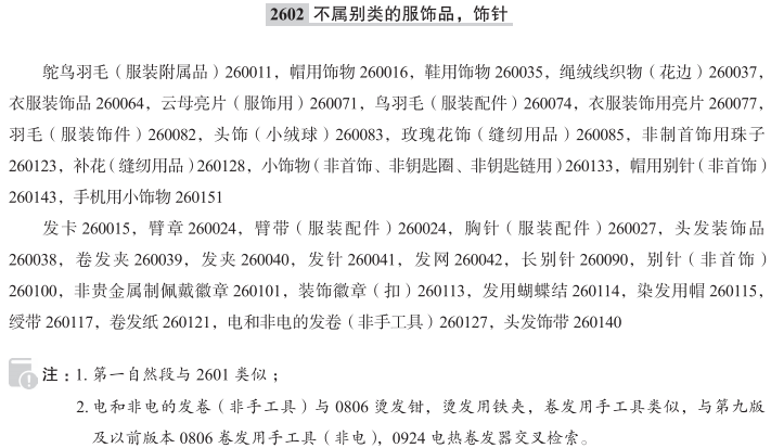 鸵鸟羽毛(服装附属品)260011; 发卡260015; 帽用饰物260016; 臂章260024; 臂带(服装配件)260024; 胸针(服装配件)260027; 鞋用饰物260035; 绳绒线织物(花边)260037; 头发装饰品260038; 卷发夹260039; 发夹260040; 发针260041; 发网260042; 衣服装饰品260064; 云母亮片(服饰用)260071; 鸟羽毛(服装配件)260074; 衣服装饰用亮片260077; 羽毛(服装饰件)260082; 头饰(小绒球)260083; 玫瑰花饰(缝纫用品)260085; 长别针260090; 别针(非首饰)260100; 非贵金属制佩戴徽章260101; 装饰徽章(扣)260113; 发用蝴蝶结260114; 染发用帽260115; 绶带260117; 卷发纸260121; 非制首饰用珠子260123; 电和非电的发卷(非手工具)260127; 补花(缝纫用品)260128; 小饰物(非首饰、非钥匙圈、非钥匙链用)260133; 头发饰带260140; 帽用别针(非首饰)260143; 手机用小饰物260151; 别针徽章扣260156; 服装用刺绣贴片; 发扣; 波浪形发卡; 服装布贴; 马尾辫用发圈; 金属箔(服装饰品); 胡须罩网; 食品服务行业用胡须罩; 海绵杠发卷; 染发用锡纸; 军用臂章; 围巾夹(非首饰); 非用于制造珠宝的珠子(服饰用); 服装用胸针; 非贵金属制鞋饰品; 服装用人造花; 固定别针; 和服带留; 梳子状的发饰品; 日式传统发型发髻用穗状装饰物; 标记别针; 帽子用非装饰别针; 发爪夹; 发圈; 卷发器(非手工具); 安全别针; 发簪;