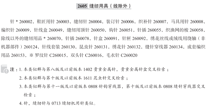 针260002; 鞋匠用针260003; 缝纫针260004; 装订针260006; 织补针260007; 马具用针260008; 编织针260009; 针线盒260049; 缝纫用顶针260050; 钩针260051; 针插260055; 织渔网的梭260058; 除线以外的缝纫用品260070; 针盒260091; 针匣260092; 绣花丝线或绒线用绕轴(非机器部件)260124; 针线套装260130; 昆虫针260131; 绣花针260132; 缝针穿线器260134; 带灯饰的人造花制花环260138; 成套编织用品260153; 划布轮260157; 梭编用梭260159; 缝纫针匣260159; 罗纹针; 双头针; 毛衣针; 编织用钩针; 织榻榻米用针; 编织针专用盒; 贵金属制缝纫针盒; 贵金属制针盒; 固定昆虫标本用金属针; 手工编织针; 缝帆布针; 带椭圆形针眼的缝纫针;