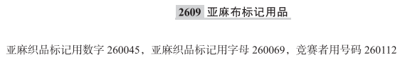 亚麻织品标记用数字260045; 亚麻织品标记用字母260069; 竞赛者用号码260112; 亚麻织品标记用数字或字母; 亚麻织品标记用交织字母饰片;