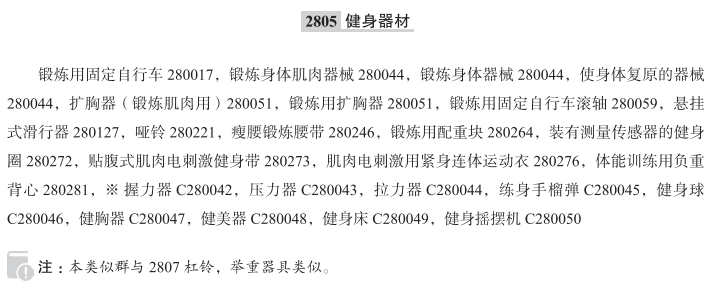 锻炼用固定自行车280017; 力量训练器械280044; 锻炼身体肌肉器械280044; 锻炼身体器械280044; 扩胸器(锻炼肌肉用)280051; 锻炼用扩胸器280051; 锻炼用固定自行车滚轴280059; 悬挂式滑行器280127; 哑铃280221; 瘦腰锻炼腰带280246; 锻炼用配重块280264; 装有测量传感器的健身圈280272; 贴腹式肌肉电刺激健身带280273; 肌肉电刺激用紧身连体运动衣280276; 体能训练用负重背心280281; 减压握力球280290; 握力器; 压力器; 拉力器; 练身手榴弹; 健身球; 健胸器; 健美器; 健身床; 健身摇摆机; 健身用健腹轮; 俯卧撑支架; 健身踏板; 健身用拉筋板; 手部锻炼用减压球; 深蹲架; 普拉提软式重力球; 健身用仰卧起坐板; 健身用俯卧撑架; 健身用握力圈; 压力消除健身球; 门框安装式引体向上杆; 健身用水阻划船机; 有氧踏板操用踏板; 锻炼用弹簧杆; 旋转俯卧撑支架; 锻炼用滑轮; 健身用椭圆机; 健身踏步机; 锻炼用哑铃; 跑步机; 有氧踏步机; 锻炼用跑步机; 壶铃;