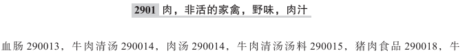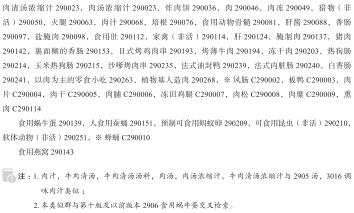 血肠290013; 牛肉清汤290014; 肉汤290014; 牛肉清汤汤料290015; 猪肉食品290018; 牛肉清汤浓缩汁290023; 肉汤浓缩汁290023; 炸肉饼290036; 肉290046; 肉冻290049; 猎物(非活)290050; 火腿290063; 肉汁290068; 烹饪用肉汁290068; 培根290076; 食用动物骨髓290081; 肝酱290088; 香肠290097; 盐腌肉290098; 食用肚290112; 家禽(非活)290114; 肝290124; 腌制肉290137; 食用蜗牛蛋290139; 猪肉290142; 食用燕窝290143; 人食用蚕蛹290151; 裹面糊的香肠290153; 日式烤鸡肉串290193; 烤薄牛肉290194; 冻干肉290203; 预制可食用蚂蚁卵290209; 可食用昆虫(非活)290210; 热狗肠290214; 玉米热狗肠290215; 沙嗲烤肉串290235; 法式油封鸭290239; 法式内脏肠290240; 白香肠290241; 软体动物(非活)290251; 以肉为主的零食小吃290263; 植物基人造肉290268; 风肠; 板鸭; 肉片; 肉干; 肉脯; 冻田鸡腿; 肉松; 肉糜; 蜂蛹; 熏肉; 熟肉块; 摩泰台拉香肠; 熟蜗牛; 意大利肉肠; 腌咸牛肉末; 鸡肉慕斯; 加工过的牛肉; 大香肠; 肉泥; 烧鸡; 冷藏的炸鸡肉; 速冻肥肝丁; 熟火腿; 牛蛙(非活); 鸭肉干; 肉卷; 炸香肠; 鸡高汤; 鸡汤浓缩精; 食用牛蹄筋; 炖肉; 牛骨汤; 加工过的蜗牛(食用蜗牛); 冷切肉; 牛肉; 猪后肘; 牛板筋(牛肉食品); 羊肉片; 鸡胗; 鹅肝酱; 牛肚; 卤鸭; 鸭肉; 干香肠; 脱水鸡肉; 鸭胗; 碎熏肉; 意大利辣味香肠; 膨化猪皮; 调味的烤牛肉片(烤肉); 制香肠肉馅; 以肉为主的预先准备好的菜; 墨西哥式炸肉皮; 小香肠; 猪肝; 猪肘; 速冻肥肝片; 鹅肝; 人工养殖供食用的蜗牛(非活); 浓肉汁; 猪肚; 食用鸭血; 屠宰过的家禽; 烤鸭; 烤牛肉; 未煮的香肠; 腌猪脚; 意式熏香肠; 禽肉浓缩汁; 浓缩汤汁; 酱油等浸煮的肉(佃煮肉); 冷藏猪肉片; 食用鸡爪; 食用鸭掌; 炸鸡肉丸; 鸡翅中; 肉块; 鹅掌; 熟肉酱; 猪肩肉; 肉汁清汤; 卤鸡; 用作三明治馅料的鸡肉块; 羊肉丸; 鸡肉; 加泰罗尼亚猪肉肠; 速冻家禽肉; 熏香肠; 烧烤用肉; 牛肉丸子; 煮香肠; 鹅肝冻; 鹅肝块; 块状食用动物肝脏; 半成品家禽肉; 食用动物肝脏; 涂面包用家禽肉酱; 涂面包用肉酱; 速冻肥肝串; 乌鸡肉; 冷冻乌鸡; 煎炸肉; 酱牛肉; 腌制猪肉; 炸鸡块; 速冻蜗牛; 蜗牛肉; 猪头肉; 牛肉干; 火鸡肉; 冷冻肉; 包装好的肉; 鹅肝糊; 加工过的肉; 牛肉片; 腌咸牛肉; 牛肉浓汁汤; 鸡肉丸子; 熟肉制品; 用于制作涂抹酱的肉; 食用猪血; 彝斯咖魔(预制可食用蚂蚁卵); 生火腿; 鸭肠; 肉干块; 脱水家禽肉; 火鸡肝; 牛蛙肉; 肥肉; 食用青蛙(非活); 肥肝; 西班牙式辣味香肠; 羊肉; 小牛肉; 半成品肉; 脱水猪肉; 鸭脖; 鸡肉丸; 牛肉汤; 速冻鸡肉; 熏肉片; 猪肉干; 羊肝; 炸肉; 鸡翅根; 食用猪肠; 速冻肥肝; 加工过的人食用蜂蛹; 炖煮肉汤; 腌制的肉; 煮猪肉; 带骨猪排; 酱肉; 猪肉冻; 肉丸; 红肠; 肥肝酱; 浓味熏牛肉; 烤肉串; 猪肉丸子; 肉(腌制的); 动物肝; 猪肉片; 冷藏的肉排; 牦牛肉干; 炸猪排; 肝糊; 食用蚕蛹; 煎肉; 猪排; 鸭翅; 肥鹅肝块; 腊肉; 干制肉; 肉馅; 鹅肝肠; 烤肉; 碎肉; 鸡腿; 加工的小羊肉; 牛排; 鸡肉干; 鸡翅; 鸡肉沙拉; 以猎物为主的预先准备好的食物; 哈吉斯(苏格兰肉馅羊肚); 炖牛肉;