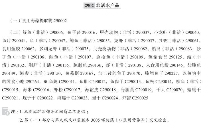 食用海藻提取物290002; 鳀鱼(非活)290006; 鱼子酱290016; 甲壳动物(非活)290037; 小龙虾(非活)290040; 鱼片290041; 鱼(非活)290047; 鲱鱼(非活)290055; 龙虾(非活)290057; 牡蛎(非活)290061; 食用鱼胶290062; 多刺龙虾(非活)290075; 贝壳类动物(非活)290082; 贻贝(非活)290083; 沙丁鱼(非活)290106; 鲑鱼(非活)290107; 金枪鱼(非活)290109; 鱼制食品290125; 蛤(非活)290132; 明虾(非活)290135; 腌制鱼290136; 虾(非活)290138; 人食用鱼粉290145; 盐腌鱼290149; 海参(非活)290150; 鱼慕斯290167; 加工过的鱼子290170; 腌鳕鱼干290227; 以鱼为主的零食小吃290264; 鱼翅; 鱼肚; 鱼肉干; 鱼松; 鱿鱼(非活); 海米; 虾松; 海蜇皮; 海胆黄; 干贝; 蛤蜊干; 蚬子干; 海螺干; 蛏干; 虾酱; 龙利鱼(非活); 干鲱鱼子; 去皮鲱鱼片; 雪蟹(非活); 蓝贻贝(非活); 鲻鱼子沙拉; 鱿鱼干; 仿蟹肉; 鲤鱼(非活); 冷冻泥鳅; 冷冻鳗鱼; 鲍鱼(非活); 加工过的海鲜; 冻鲑鱼; 蟹肉饼; 加工过的扇贝裙边; 象拔蚌(非活); 寻氏肌蛤(非活); 烟熏鲑鱼片; 炸鱼肉丸; 田螺(非活); 熏鲑鱼; 非活的鲱鱼; 非活的鲱鱼子; 海兔干; 鲱鱼子(非活); 鲑鱼肉干; 盐发酵的海胆籽; 舟贝(非活); 海鲷(非活); 炸鱼棒; 煮制和干制鱼; 鲑鱼块; 咸鲑鱼; 鲑鱼卷; 加工过的乌鱼子; 鮟鱇鱼肝; 腌制鲱鱼; 鲅鱼(非活); 多春鱼(非活); 海螺片; 腌鲅鱼干; 海鲈鱼(非活); 鱼腌制品; 椰味炸虾; 经过煮、熏并风干的鲣鱼块; 黑鱼子酱; 烟熏的鲱鱼; 盐渍鲱鱼; 食用海肠(非活); 冷冻鱼; 腌制的鲱鱼; 酱鲑鱼; 鱼糕(鱼制食品); 烤鱼片; 虾干; 鳀鱼片; 非活的鲑鱼; 鳟鱼(非活); 鲑鱼肉串; 章鱼(非活); 鲑鱼肝酱; 鲑鱼子酱; 磷虾(非活); 鱼丸子; 鲽鱼(非活); 鲫鱼(非活); 剑鱼(非活); 鲢鱼(非活); 鲈鱼(非活); 比目鱼(非活); 鱼肉香肠; 短颈蛤(非活); 五香熏鲑鱼; 海蜗牛(非活的); 熏鱼; 蟹肉; 鱼排; 黄花鱼(非活); 腌制海蜇; 螃蟹(非活); 加工过的蟹子; 鳗鱼(非活); 烟熏鲑鱼; 干制鲱鱼子(非活的); 冷冻贝壳类动物; 海胆(非活); 炸鱼条; 炸鱼饼; 干制鲱鱼子(非活); 加工过的鱼; 腌制鲑鱼; 香鱼(非活); 章鱼丸; 干鱼片; 鳕鱼(非活);