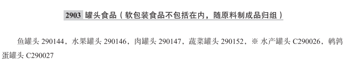 2903-罐头食品(软包装食品不包括在内,随原料制成品归组)