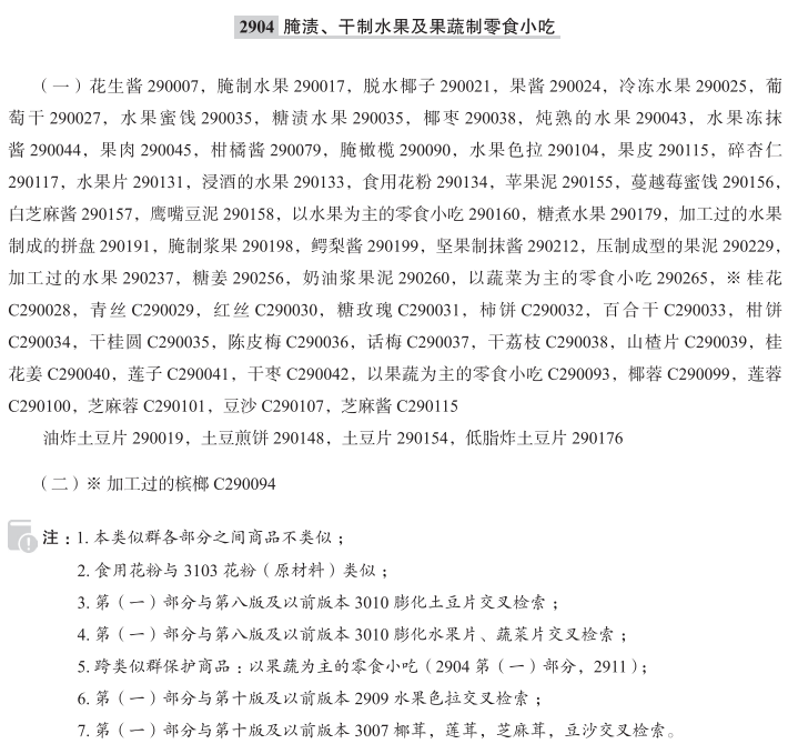 花生酱290007; 腌制水果290017; 薯片290019; 油炸土豆片(零食小吃)290019; 脱水椰子290021; 果酱290024; 冷冻水果290025; 葡萄干290027; 水果蜜饯290035; 糖渍水果290035; 加工过的椰枣290038; 炖熟的水果290043; 水果冻抹酱290044; 果肉290045; 柑橘酱290079; 腌橄榄290090; 水果色拉290104; 果皮290115; 碎杏仁290117; 水果片290131; 水果脆片290131; 浸酒的水果290133; 食用花粉290134; 苹果泥290155; 蔓越莓蜜饯290156; 白芝麻酱290157; 鹰嘴豆泥290158; 以水果为主的零食小吃290160; 低脂薯片290176; 低脂炸土豆片(零食小吃)290176; 糖煮水果290179; 加工过的水果制成的拼盘290191; 腌制浆果290198; 鳄梨酱290199; 坚果制抹酱290212; 压制成型的果泥290229; 加工过的水果290237; 糖姜290256; 奶油浆果泥290260; 以蔬菜为主的零食小吃290265; 切好的水果290269; 以海藻为主的零食小吃290273; 桂花; 青丝; 红丝; 糖玫瑰; 柿饼; 百合干; 柑饼; 干桂圆; 陈皮梅; 话梅; 干荔枝; 山楂片; 桂花姜; 莲子; 干枣; 以果蔬为主的零食小吃; 加工过的槟榔; 椰蓉; 莲蓉; 芝麻蓉; 豆沙; 芝麻酱; 椰子粉; 蛋糕和馅饼用水果馅料; 炸土豆饼; 水果皮; 食用松花粉; 芒果干; 加工过的鳄梨; 越橘果酱(蜜饯); 橄榄酱; 桑葚干; 炸薯格; 油炸山药薄片; 柠檬酱; 枣泥; 粉状果仁酱; 无花果干; 坚果酱; 木薯薯片; 磨碎的杏仁; 紫薯片; 磨碎的马铃薯块; 加工过的杏; 苹果酱(蜜饯); 加工过的椰肉; 马铃薯丸子; 加工过的苹果; 即食薯泥; 加工过的荔枝; 干椰枣; 以魔芋为主的零食小吃; 菠萝干; 蔬菜脆片; 土豆条; 果泥皮; 蔓越莓干; 糊状山梨豆(鹰嘴豆酱); 马铃薯薯条; 以甜玉米粒为主的零食小吃; 水果果酱; 水果干粉; 膨化蔬菜片; 腌渍水果; 酒渍水果; 桔饼; 西梅干; 炸薯条; 番茄蜜饯; 蜜饯水果; 发酵的水果; 加工过的橙子; 榴莲干; 加工过的橄榄; 蓝莓果酱; 鳄梨酱(捣碎的鳄梨); 加工过的桑椹; 香蕉片; 干橄榄; 水果抹酱; 果脯; 油炸土豆; 水果慕斯; 榛子抹酱; 蔓越莓果酱; 猕猴桃片; 桃片; 羽衣甘蓝脆片; 蔓越莓果酱(蜜饯); 蓝莓干; 梨蜜饯; 膨化水果片; 膨化土豆片; 苹果片; 木薯片; 水果干; 低脂土豆片; 椰丝; 以土豆为主的零食小吃; 草莓干; 苹果酱; 混合水果干; 冷冻炸薯条; 冷冻薯条; 速冻水果; 加工过的桃子; 木瓜干; 水果泥; 煮熟的橄榄; 西瓜酱;