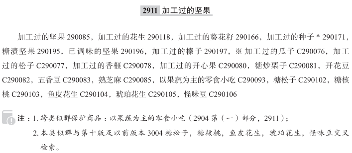 加工过的坚果290085; 加工过的花生290118; 加工过的葵花籽290166; 加工过的种子290171; 糖渍坚果290195; 已调味的坚果290196; 加工过的榛子290197; 加工过的瓜子; 加工过的松子; 加工过的香榧; 加工过的开心果; 糖炒栗子; 开花豆; 五香豆; 熟芝麻; 以果蔬为主的零食小吃; 糖松子; 糖核桃; 鱼皮花生; 琥珀花生; 怪味豆; 坚果和种子制零食棒; 松仁; 加工过的可食用种子; 盐焗腰果; 加工过的食用奇亚籽; 烘制过的坚果; 加工过的西瓜籽; 加工过的夏威夷果; 加工过的奇亚籽; 糖渍肉豆蔻果; 加工过的碧根果; 加工过的南瓜子; 油炸花生米; 加工过的杏仁; 熟芝麻(非调味品); 加工过的核桃; 以种子为主的零食小吃; 炒豆; 加工过的胡桃;