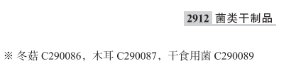 冬菇; 木耳; 干食用菌; 干茶树菇; 干姬菇; 干羊肚菌; 干制的食用绣球菌; 干平菇; 食用干黑木耳; 食用干银耳; 干制竹荪; 干的松露; 干牛肝菌; 干香菇; 食用干杏鲍菇; 食用干姬松茸;