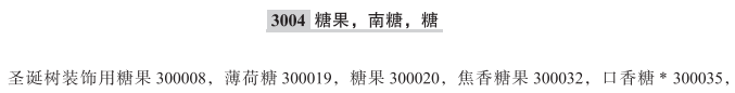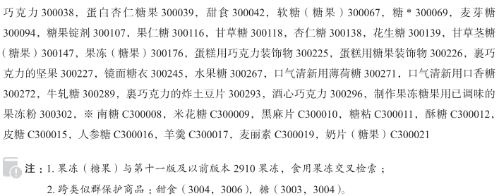 圣诞树装饰用糖果300008; 薄荷糖300019; 糖果300020; 焦香糖果300032; 口香糖300035; 巧克力300038; 蛋白杏仁糖果300039; 甜食300042; 软糖(糖果)300067; 糖300069; 麦芽糖300094; 糖果锭剂300107; 果仁糖300116; 甘草糖300118; 杏仁糖300138; 花生糖300139; 甘草茎糖(糖果)300147; 果冻(糖果)300176; 蛋糕用巧克力装饰物300225; 蛋糕用糖果装饰物300226; 裹巧克力的坚果300227; 镜面糖衣300245; 水果糖300267; 口气清新用薄荷糖300271; 口气清新用口香糖300272; 牛轧糖300289; 裹巧克力的炸土豆片300293; 酒心巧克力300296; 制作果冻糖果用已调味的果冻粉300302; 南糖; 米花糖; 黑麻片; 糖粘; 酥糖; 皮糖; 人参糖; 羊羹; 麦丽素; 奶片(糖果); 棉花软糖制食品顶部装饰物; 糖衣硬焦糖; 花生糖果; 巧克力棒; 泡泡糖; 无糖口香糖; 棉花软糖; 烘焙用糖果碎粒; 裹巧克力的榛子; 糖豆; 非医用口香糖; 俄罗斯棉花糖(甜食); 不含奶的巧克力; 淀粉制糖果; 牛奶巧克力; 土耳其软糖; 糖果(甜食); 含绿芥末的巧克力; 山核桃棍糖; 胶冻状甜豆沙条(羊羹); 无糖糖果; 饴糖; 巧克力片; 冰冻糖果; 巧克力糖果; 糕点装饰用巧克力; 含有磨碎的咖啡豆的巧克力片; 糖果和面包用巧克力; 奶油糖果片; 装饰糕点甜食用糖珠; 含焦糖的糖果; 含可可的糖果; 太妃糖; 红参糖(糖果); 含冰淇淋的冰冻糖果; 巧克力糖; 凝胶软糖; 淀粉型糖果; 松露巧克力; 果仁薄脆糖; 裹糖的苹果(糖果); 花生酱糖果片; 蛋糕用糖果装饰品; 花生脆糖; 豆形软糖; 棒棒糖; 食用麦芽糖; 果冻糖; 牛奶硬块糖(糖果); 蛋糕用巧克力装饰品; 条状糖果; 夹心糖; 硬糖; 夹心巧克力; 裹巧克力的水果; 棉花糖;