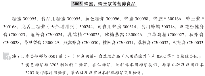 糖蜜300095; 食品用糖蜜300095; 黄色糖浆300096; 蜂蜜300098; 蜂胶300166; 蜂王浆300168; 龙舌兰糖浆(天然增甜剂)300244; 可食用蜂房300314; 食用蜂蜡300318; 花粉健身膏; 龟苓膏; 乳鸽精; 冰糖燕窝; 虫草鸡精; 秋梨膏; 苓贝梨膏; 燕窝梨膏; 桂圆膏; 荔枝膏; 枇杷膏; 烹饪用淀粉糖浆; 浇头糖浆; 烹饪用玉米糖浆; 食用洋槐蜜; 柚子蜂蜜膏; 草本蜂蜜; 用作天然增甜剂的龙舌兰糖浆; 枫树糖浆; 糖蜜糖浆; 蜂蜜替代品; 棉花糖酱; 雪莲果糖浆; 人食用蜂胶; 食用淀粉糖浆; 薄烤饼用糖浆; 粉状淀粉糖浆(食用);