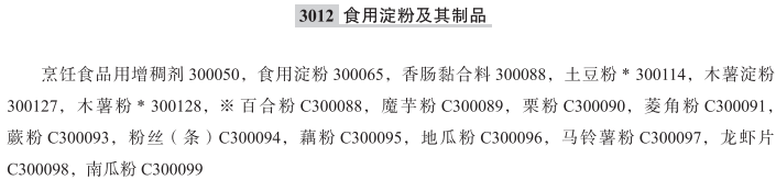 烹饪食品用增稠剂300050; 食用淀粉300065; 香肠黏合料300088; 土豆粉300114; 木薯淀粉300127; 木薯粉300128; 百合粉; 魔芋粉; 栗粉; 菱角粉; 蕨粉; 粉丝(条); 藕粉; 地瓜粉; 马铃薯粉; 龙虾片; 南瓜粉; 蕃薯粉; 食用马铃薯淀粉; 大米淀粉; 紫薯粉; 蕨根粉; 烹饪用玉米淀粉; 食用木薯粉; 粉条; 食用地瓜粉; 玉米淀粉(食品用); 马铃薯粉(食用); 西谷椰子淀粉(食用); 粉丝(未烹调); 食用葛粉; 玉米淀粉; 烹饪用日本竹芋粉; 芋头粉; 小麦淀粉; 凉粉(食用淀粉制品); 烹饪用增稠剂; 粉丝; 荸荠粉; 制粉圆用淀粉; 烹饪用瓜尔胶; 虾片; 食用土豆粉; 山药淀粉;