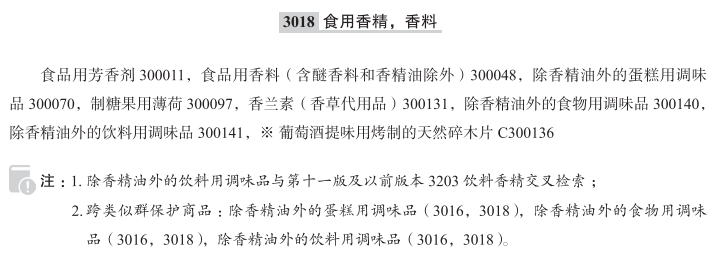 食品用芳香剂300011; 食品用香精300048; 制糖果用薄荷300097; 葡萄酒提味用烤制的天然碎木片; 除香精油外的黄油用调味品; 除香精油外的奶酪用调味品; 除香精油外的汤用调味品; 制饮料用草本调味品(香精油除外); 食用芳香剂;