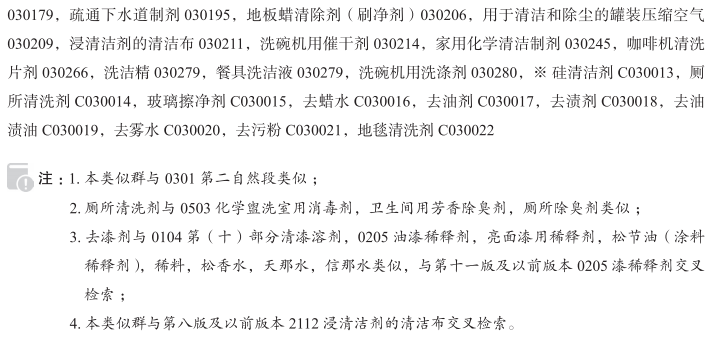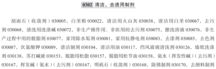刮面石(收敛剂)030005; 白垩粉030022; 清洁用火山灰030038; 清洁用白垩030067; 去污剂030068; 清洗用洗涤碱030072; 非生产操作用、非医用的去污剂030075; 擦洗溶液030076; 非生产过程中用的脱脂剂030077; 家用除水垢剂030081; 家用抗静电剂030083; 去漆剂030085; 去色剂030087; 次氯酸钾030089; 清洁制剂030104; 清洁用油030117; 挡风玻璃清洗剂030126; 墙纸洗涤剂030138; 苏打碱液030153; 脱脂用松脂030157; 脱脂用松节油030158; 氨水(挥发性碱)(去污剂)030167; 挥发碱(氨水)(去污剂)030167; 明矾石(收敛剂)030168; 除锈制剂030170; 去颜料制剂030179; 疏通下水道制剂030195; 地板蜡清除剂(刷净剂)030206; 用于清洁和除尘的罐装压缩空气030209; 浸清洁剂的清洁布030211; 洗碗机用催干剂030214; 家用化学清洁制剂030245; 咖啡机清洗片剂030266; 餐具洗洁液030279; 洗洁精030279; 洗碗机用洗涤剂030280; 硅清洁剂; 厕所清洗剂; 玻璃擦净剂; 去蜡水; 去油剂; 去渍剂; 去油渍油; 去雾水; 去污粉; 地毯清洗剂; 家用清洁剂; 去污制剂; 卫生间清洁剂; 洁厕凝胶; 清漆去除剂; 清洁用去蜡水; 清洁用去油剂; 擦洗液; 牙科超声波消毒装置用清洁溶液; 洗碗粉; 玻璃清洁剂; 通用去渍粉; 化妆用刮面石(收敛剂); 玻璃清洁制剂; 地板蜡清除剂; 照相机镜头清洁液; 浸去污剂的眼镜布; 浸有清洁制剂的纸巾; 除漆用化合物; 家用清洁剂喷雾; 抽水马桶用清洁剂; 浸清洁制剂的海绵; 马桶清洁剂; 汽车用清洁制剂; 清洁用氨水; 汽车用清洁剂; 家用清洁制剂; 用于清洁运动员口防护器的喷洗剂; 水果和蔬菜清洗剂; 预润湿浸渍餐具洗涤剂的纸巾; 清洁下水道用清洁制剂; 家用脱脂制剂; 白壁轮胎清洁剂; 地毯洗涤剂; 眼镜片清洗溶液; 泡沫清洁制剂; 浸清洁剂的湿巾; 地毯清洁制剂; 地板清洁用脱蜡剂; 家具装饰品用清洁剂; 洗碗机用清洁剂; 清洁用天然油; 打字机铅字用清洁液; 风挡玻璃清洗液; 家用除垢剂; 汽车清洁剂; 洗餐具制剂; 餐具洗涤剂; 地蜡清除剂; 烤箱清洁剂; 除蜡制剂; 皮革清洁制剂; 除蜡用松节油; 清洁去渍制剂; 去污用挥发油; 去渍粉; 汽车清洗剂; 石油制清洁剂;