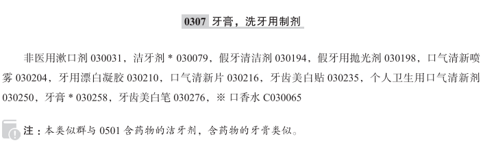 非医用漱口剂030031; 洁牙剂030079; 假牙清洁剂030194; 假牙用抛光剂030198; 口气清新喷雾030204; 牙用漂白凝胶030210; 口气清新片030216; 牙齿美白贴030235; 个人卫生用口气清新剂030250; 牙膏030258; 牙齿美白笔030276; 口香水; 牙齿美白制剂; 漱口剂; 漱口水; 牙齿美白霜; 洁牙液; 可吞咽牙膏; 不含药物的牙齿清洗剂; 非医用牙科冲洗剂; 浸增白剂的牙齿增白条(化妆品); 口香糖式的洁牙剂; 固体牙膏; 清洁假牙制剂; 牙齿清洁制剂; 湿牙粉; 牙齿保持器用清洁片; 不含药物的漱口水; 不含药物的漱口剂; 牙齿清洗液; 牙齿抛光剂; 美白牙膏; 不含药物的洁牙剂; 牙粉; 固体洁牙剂;