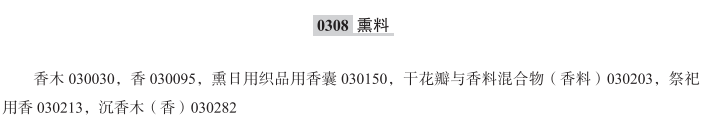 香木030030; 香薰用香味水030091; 香030095; 香薰用精油030118; 熏日用织品用香囊030150; 干花瓣与香料混合物(香料)030203; 祭祀用香030213; 沉香木(香)030282; 香薰用香精油030286; 香薰用香精030289; 熏香制剂(香料); 干花瓣和香料的芳香混合物; 室内清新用香薰束; 干花瓣与香料混合物; 香袋; 芳香松果(熏香用); 熏香棒; 房间用非电香薰器的香薰剂补充装; 熏香;