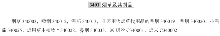 烟草340003; 嚼烟340012; 雪茄340013; 非医用含烟草代用品的香烟340019; 香烟340020; 小雪茄340025; 烟用草本植物340028; 鼻烟340033; 用作烟草代用品的尼古丁袋(非医用)340047; 烟丝; 烟末; 已调味的烟草; 吸烟用烟草; 烟草叶; 手卷烟; 过滤嘴香烟; 小雪茄烟; 雪茄烟; 香烟用烟草; 水烟用烟丝; 卷烟; 非医用烟草代用品; 烟草(处理过和加工过的); 含薄荷醇的烟草; 烟斗用含薄荷醇烟草; 薄荷香烟; 无烟烟草; 烟草筒芯用烟草;
