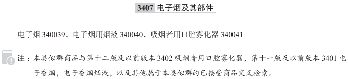 电子烟340039; 电子烟用烟液340040; 吸烟者用口腔雾化器340041; 电子烟烟盒; 电子香烟; 电子香烟烟液; 电子香烟用尼古丁液; 电子香烟用尼古丁替代液; 用作传统香烟替代品的电子烟; 电子烟用尼古丁液; 用作传统香烟替代品的电子香烟; 销售时已填充丙三醇的吸烟用口腔雾化器; 销售时已填充丙三醇的吸烟用一次性口腔雾化器; 电子雪茄;
