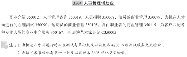 职业介绍350012; 人事管理咨询350019; 人员招聘350068; 演员的商业管理350079; 为挑选人才而进行的心理测试350090; 运动员的商业管理350105; 自由职业者的商业管理350115; 为客户匹配各种专业人员的商业中介服务350167; 表演艺术家经纪; 职业安置; 职业介绍所服务; 人员安置; 演员就业与管理方面的人才经纪服务; 人力资源咨询; 员工派遣; 职业安置咨询服务; 人员招收服务; 职业介绍所; 人员招收和职业介绍所; 通过心理测试挑选人才; (被解雇后的)新职介绍服务; 职位查找和就业介绍服务; 工作和人员的安排; 介绍工作; 演员的管理; 专业运动员的管理; 员工职务调整; 人才中介(管理或职业介绍); 确定工人综合技能和其他职位要求的工作分析服务; 雇员配置咨询服务; 员工意见调查; 儿童保姆工作安排服务; 招聘咨询; 人事管理; 实习安置服务; 人员安置和招收; 办公室后勤人员的招聘服务; 面向互惠生的职业介绍服务; 提供就业咨询服务; 职员安置服务; 家政人员招聘辅助; 人事咨询; 专业劳务派遣服务; 临时职业介绍所; 提供就业信息; 人力资源管理; 人员招收咨询; 人员招收; 就业招聘服务; 高级管理人员选拔服务;