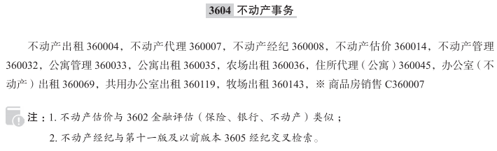 不动产出租360004; 不动产代理360007; 不动产经纪360008; 不动产估价360014; 不动产管理360032; 公寓管理360033; 公寓出租360035; 农场出租360036; 住所代理(公寓)360045; 办公室(不动产)出租360069; 共用办公室出租360119; 牧场出租360143; 商品房销售; 办公室空间出租; 永久性住房的出租; 度假屋的不动产管理; 建筑物租赁或出租; 通过互联网提供不动产出租信息; 通过互联网、通讯设备或电子方式提供不动产咨询信息; 通过互联网提供的不动产管理服务; 为买卖建筑物提供不动产代理; 居住用不动产代理服务; 学生公寓出租; 退休社区的不动产管理; 有关娱乐场所的不动产管理服务; 与购物中心相关的不动产管理服务; 不动产管理服务; 厂房出租; 不动产出租服务; 住房出租; 购物中心空间的租赁; 通过互联网提供不动产代理; 不动产的金融评估;