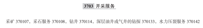 采矿370107; 采石服务370108; 钻井370114; 深层油井或气井的钻探370133; 水力压裂服务370142; 抽石油; 天然气开采; 天然气开采服务; 矿山开采; 石油钻井工具出租; 钴矿开采; 锂矿开采; 天然气钻井; 石油开采; 石油钻探和抽取; 钻探平台出租; 抽取原油; 稀土开采; 打水井; 石油钻井; 石英岩矿开采; 钨矿开采; 油井钻探; 宝石开采; 贵金属开采; 钻石开采; 石油的开采和抽取; 铀矿开采; 原油钻探; 镍矿开采; 石油和天然气的开采;