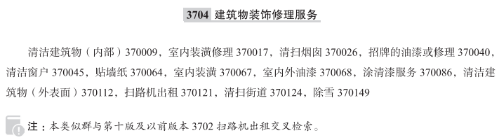 清洁建筑物(内部)370009; 室内装潢修理370017; 清扫烟囱370026; 招牌的油漆或修理370040; 清洁窗户370045; 贴墙纸370064; 室内装潢370067; 室内外油漆370068; 涂清漆服务370086; 清洁建筑物(外表面)370112; 扫路机出租370121; 清扫街道370124; 除雪370149; 公路标志牌修理; 冷暖设备安装; 油漆服务; 室内装潢的清洁; 地板上光; 清洗烟囱; 洗手间清洁服务; 除雪服务; 门框修理; 修理窗用百叶帘; 清洁建筑物正面; 修理招牌; 油漆招牌; 标志牌修理; 窗框上油漆; 建筑物清洁服务; 贴墙纸服务; 排水管清洗服务; 贴挂壁纸; 工业场所清洁; 地板防滑安全保护层涂刷; 地板清洁机器出租; 装饰油漆服务; 为建筑物涂覆涂料; 为建筑物涂覆防护漆; 住宅清洁; 清理和清洁檐沟; 体育场清洁; 装饰性的室内粉刷服务; 房屋清洁; 清洁建筑物; 建筑物保养和修理; 地毯的铺设; 室内装潢清洁服务; 场所的专业清洁服务; 商业场所的清洁; 拖把出租; 清洁建筑物外表面; 砖石墙壁和砖石结构的修复; 清洗建筑玻璃幕墙; 建筑物维护和修理; 街道清扫服务;