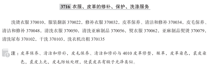 洗烫衣服370010; 服装翻新370022; 修补衣服370032; 皮革保养、清洁和修补370034; 皮毛保养、清洁和修补370048; 清洗衣服370050; 清洗亚麻制品370056; 熨衣服370062; 亚麻制品熨烫370079; 清洗尿布370102; 干洗370103; 洗衣机出租370135; 电干衣机出租; 提供清洗和烘干衣物的设备; 洗衣店服务; 洗衣设备出租; 提供自助洗衣设施; 提供洗衣设施; 纺织品洗烫; 布料洗烫; 衣物熨烫; 衣物甩干机出租; 包或袋的修理; 织物洗涤; 布料熨烫; 修补帽子; 织物熨烫; 熨烫衣服; 服装修补; 干衣机出租; 棒球手套的重新系带; 地毯清洗; 帽子修复; 服装织补; 衣物洗涤; 纺织品洗涤;