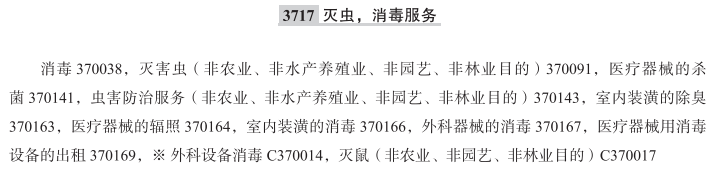 消毒370038; 灭害虫(非农业、非水产养殖业、非园艺、非林业目的)370091; 医疗器械的杀菌370141; 虫害防治服务(非农业、非水产养殖业、非园艺、非林业目的)370143; 室内装潢的除臭370163; 医疗器械的辐照370164; 室内装潢的消毒370166; 外科器械的消毒370167; 医疗器械用消毒设备的出租370169; 虫害防治熏蒸(非农业、非园艺、非林业目的)370177; 为霉菌污染修复进行表面清洁370181; 外科设备消毒; 灭鼠(非农业、非园艺、非林业目的); 灭害虫(非农业、非水产养殖业、非林业、非园艺目的); 餐具消毒; 建筑物内部表面消毒; 邮件辐照灭菌服务; 为商业建筑喷洒杀虫剂; 为居民房屋喷洒杀虫剂; 为商业建筑灭虫; 消毒剂的静电式喷雾; 建筑物内部表面的消毒; 个人防护装备的杀菌服务; 对房屋内表面进行消毒,以减少病毒和微生物的传播; 住宅虫害防治; 电话听筒消毒; 从住宅和商业建筑物驱赶鸟类; 建筑物熏蒸杀虫处理; 室内装潢除臭; 玩具消毒服务; 窗帘除臭;