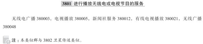 无线电广播380003; 电视播放380005; 新闻社服务380012; 有线电视播放380021; 无线广播380048; 付费电视节目播放; 借助电视播放信息; 播放电视购物节目; 无线电节目广播; 视频播送; 卫星电视广播; 广播设备出租; 有线电视播放服务; 互联网无线电广播服务; 无线电节目播放; 互联网广播服务; 向新闻报道机构传送新闻; 在全球通信网络、互联网和无线网络上同步播放电视; 有线广播服务; 按次付费电视传送服务; 电子传送的新闻社服务; 网络广播服务; 数字音频广播; 音频广播; 电视节目播放; 信息和其他节目的无线电广播; 新闻传送; 通过全球计算机网络播放节目; 有线广播播放; 有线电视节目播放; 通过互联网播放节目;
