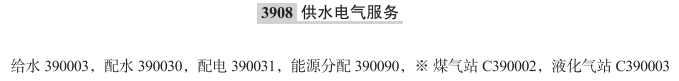 给水390003; 配水390030; 配电390031; 能源分配390090; 煤气站; 液化气站; 为建筑物供暖和制冷进行能源分配; 生物甲烷燃料的分配; 给水(分配); 可再生天然气配气; 煤气供应(分配); 供热(分配); 燃气输配; 可再生能源分配;