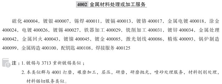 磁化400004; 镀银400007; 锡焊400011; 镀镉400013; 镀铬400017; 金属电镀400018; 涂金400024; 电镀400026; 镀锡400027; 铁器加工400029; 铣削加工400031; 镀锌400034; 金属处理400042; 金属回火400043; 镀镍400045; 镀金400085; 激光划线400086; 精炼400093; 锅炉制造400099; 金属铸造400100; 配钥匙400108; 焊接服务400125; 金属硬化; 金属切割; 金属压铸; 金属钎焊; 金属热处理; 模具铸造; 银器制作; 消磁; 金属精炼; 退磁; 锡器加工; 气焊设备出租; 金属镀釉; 焊接; 金属层压; 金属蚀刻; 金属雕刻; 电焊设备出租; 金属管的热处理; 对不锈钢片材和卷材进行表面处理; 物体表面金属化服务; 金属冲压; 金属熔炼服务; 热浸镀; 金属焊接; 退火; 金属钻孔; 金器加工; 金属电镀及层压; 金属加工; 铝的处理;