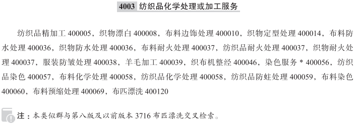 纺织品精加工400005; 织物漂白400008; 布料边饰处理400010; 织物定型处理400014; 织物防水处理400036; 布料防水处理400036; 纺织品耐火处理400037; 布料耐火处理400037; 织物耐火处理400037; 服装防皱处理400038; 羊毛加工400039; 织布机整经400046; 染色服务400056; 纺织品染色400057; 布料化学处理400058; 纺织品化学处理400058; 纺织品防蛀处理400059; 布料染色400060; 布料预缩处理400069; 布匹漂洗400120; 染色; 帷幔的定制制作; 服装阻燃处理; 织物精加工; 服装漂白; 纺织品边饰处理; 布料精加工; 耐火处理(纺织品或裘皮); 纺棉; 在纺织品上印刷图案; 地毯抗微生物处理; 纺织品防霉处理; 织物的织前准备和处理; 纺织品织造; 纺织品漂白; 纺棉花; 纺织品定型处理; 纺织品处理用机器和设备出租; 织物染色; 布料处理; 布料除臭; 织物层压; 服装定型处理; 裘皮防收缩处理; 布料漂白; 布料防皱处理; 纺织整经;