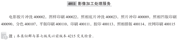 电影胶片冲洗400002; 图样印刷400022; 照相底片冲洗400023; 照片冲印400089; 照相凹版印刷400090; 分色400107; 平版印刷400110; 印刷400111; 胶印400113; 照相排版400114; 丝网印刷400115; 数字照片打印服务; 晒蓝图; 凹版印刷服务; 排版; 凹版印刷; 书籍印刷; 日历的印刷; 黑白电影的色彩增强; 黑白胶卷的色彩增强; 为他人设计印刷; 印刷机器和设备出租; 凸版印刷机出租; 人像印刷; 照片修复服务; 摄影复制; 摄影作品的保存处理; 照相制版服务; 邮票印刷; 底片修整; 底片修复; 放大照片; 数字媒体摄影图像的打印; 胶片显影; 数码印刷; 凸版印刷; 信纸印刷服务; 照片冲洗; 广告品印刷; 照片洗印; 照片放大;