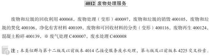 废物和垃圾的回收利用400068; 废物处理(变形)400097; 废物和垃圾的销毁400105; 废物和垃圾的焚化400106; 有害材料的净化处理400109; 净化有害材料400109; 废物和可回收材料的分类(变形)400116; 废物再生400124; 混凝土粉碎400139; 废气处理; 废水处理; 烹饪油和植物油的回收利用服务; 被捕获生物气体的处理; 医疗废物的回收利用; PET塑料瓶的回收利用; 有害废物处理服务; 温室气体处理; 已捕获的垃圾填埋气体的处理; 被捕获生物气体的洗涤; 贵金属回收; 垃圾处理; 溶剂再生; 核废料净化; (利用微生物进行净化的)生物修复服务; 废物粉碎机出租; 化粪池出租; 核燃料回收; 解毒有害材料; 化学品的回收利用; 烹饪油和蔬菜油的回收利用服务; 核燃料的回收利用; 有害液体处理; 牙科废料提炼; 辐射区净化服务; 饮料瓶回收利用; 海洋垃圾处理; 废水再处理; 硬盘销毁服务; 催化转换器的回收利用; 电池的回收利用; 废物和可回收材料的分类; 动物粪便处理; 废料压实机出租; 废物销毁; 塑料的回收利用; 废物焚化; 核废料处理; 垃圾焚化; 文件粉碎服务; 废物回收; 工业有毒废物处理; 医疗废物焚化; 垃圾焚烧; 废物回收利用服务; 废物和垃圾的回收;